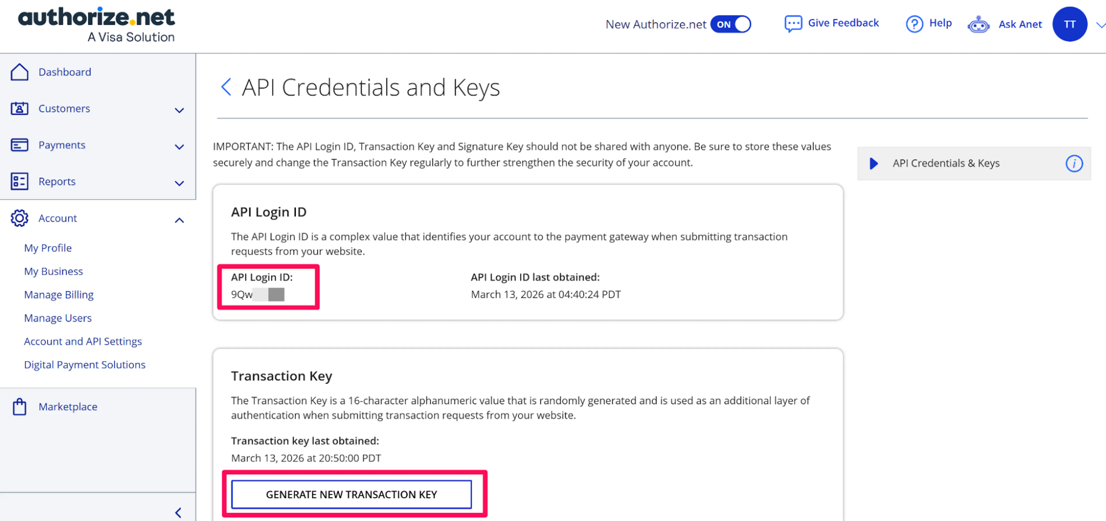 Copy your API Login ID. Generate a new Transaction Key and copy it immediately - it will only be shown once.