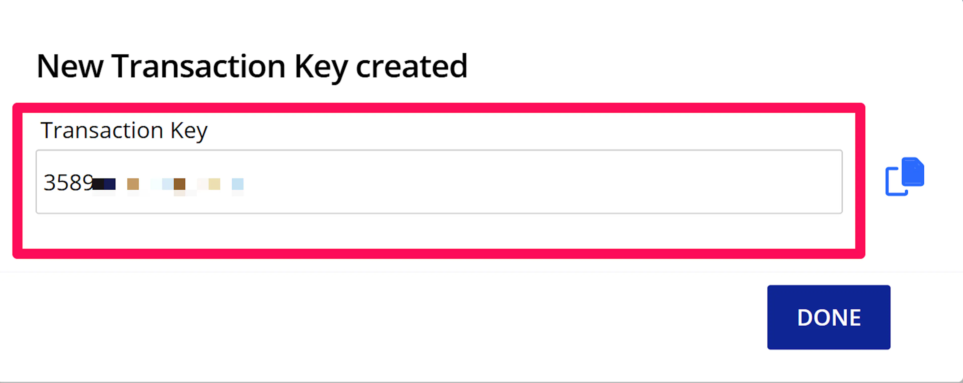 The Transaction Key is only shown once upon generation (shown only once).