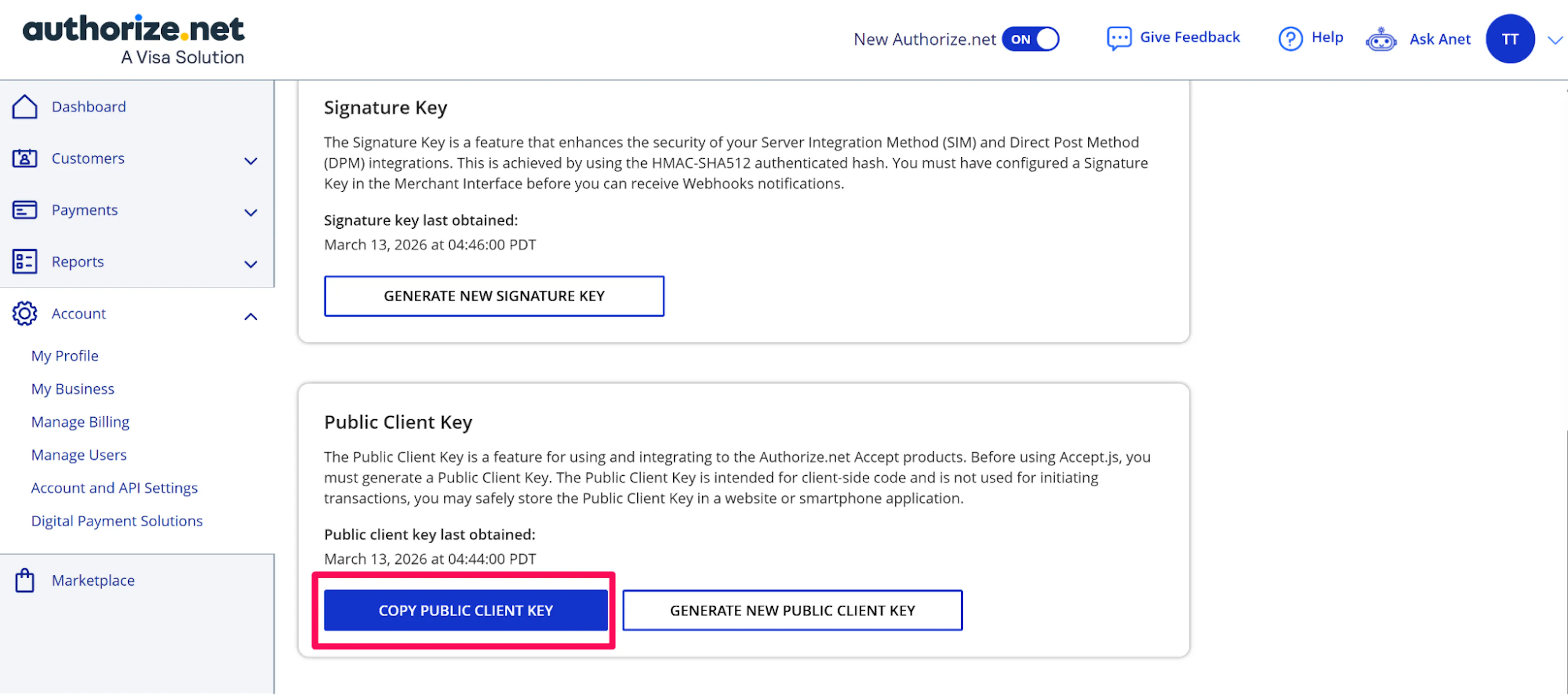 Click Generate New Public Client Key if you haven't already to generate public client key and click on Copy Public Client Key