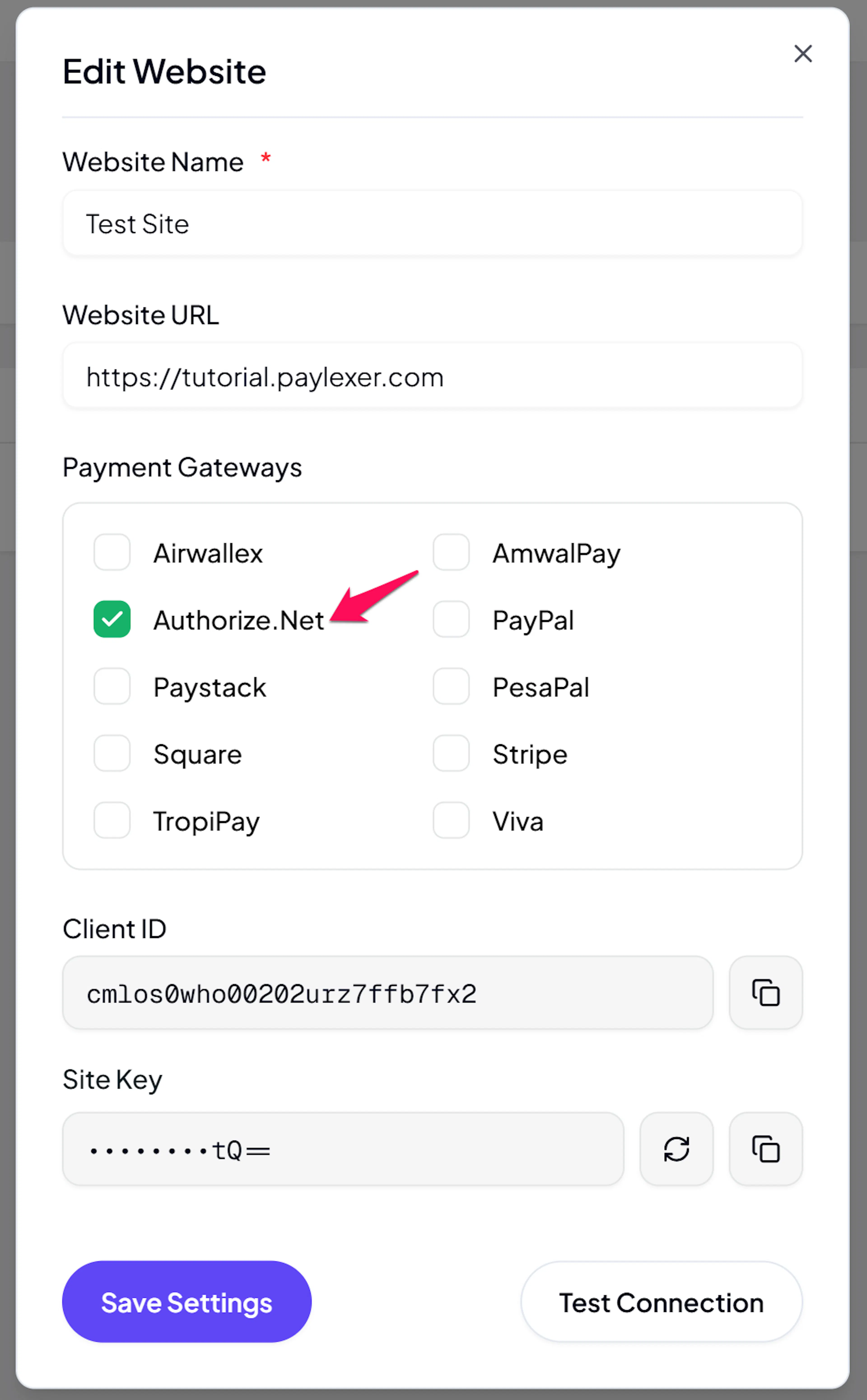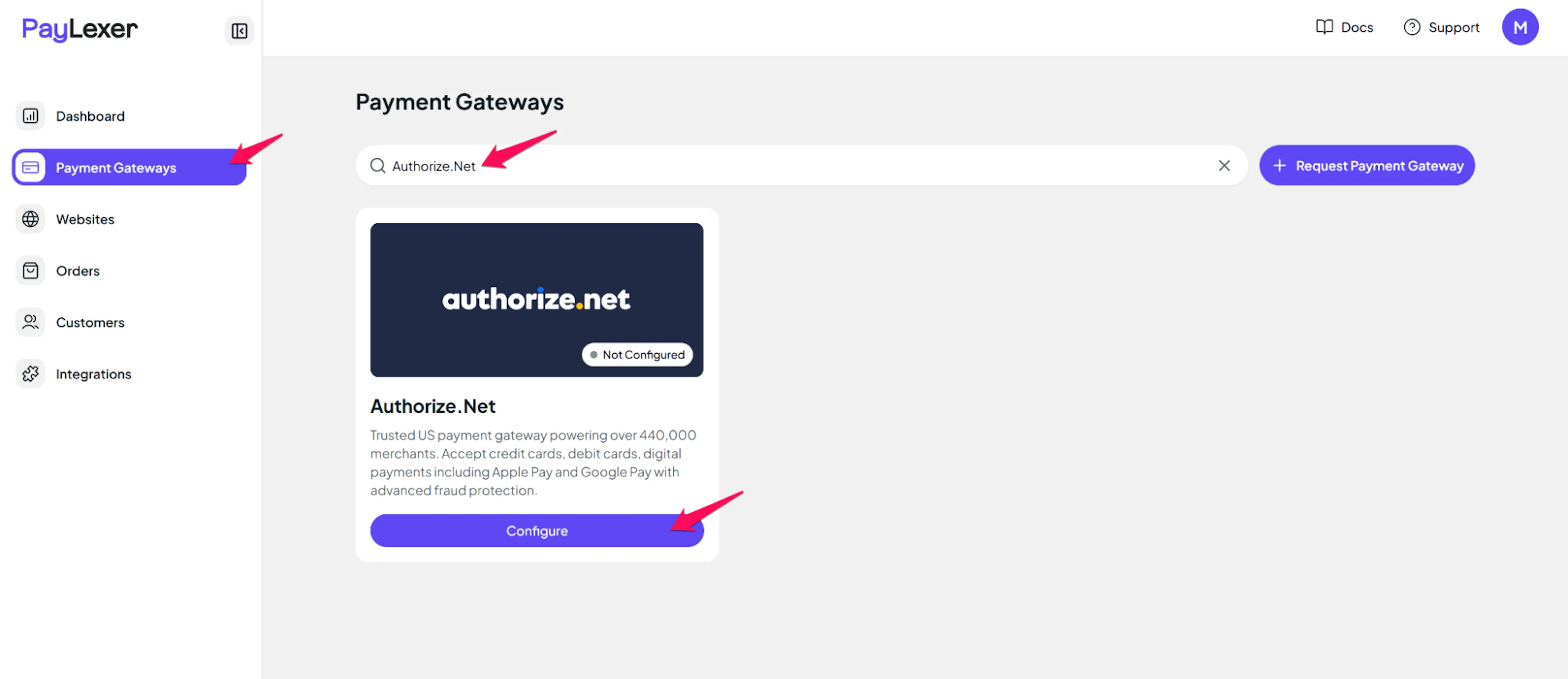 Log in to your PayLexer dashboard and navigate to Payment Gateways → Authorize.Net.