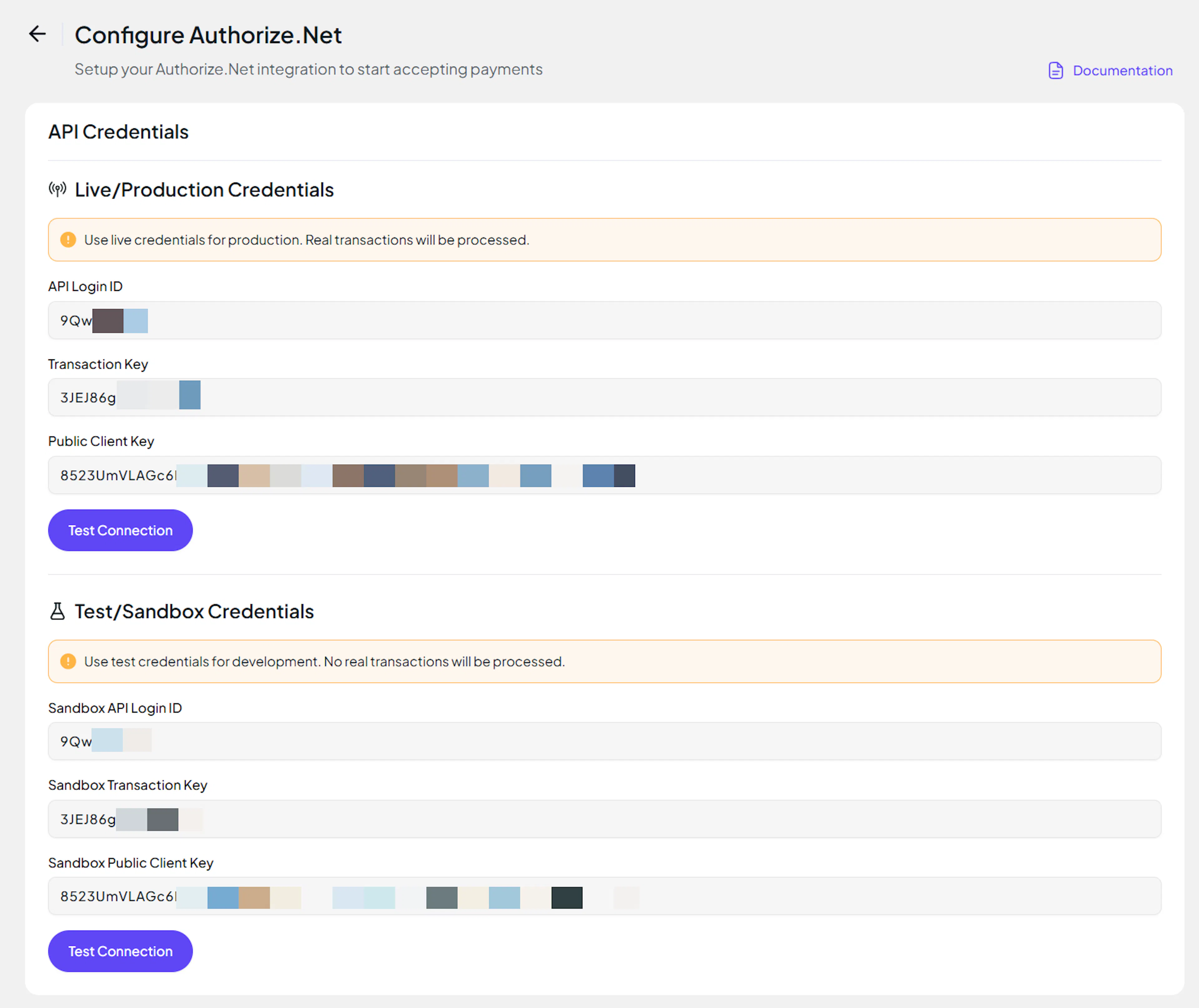 Paste the API Login ID and Transaction Key you copied from Authorize.Net.
