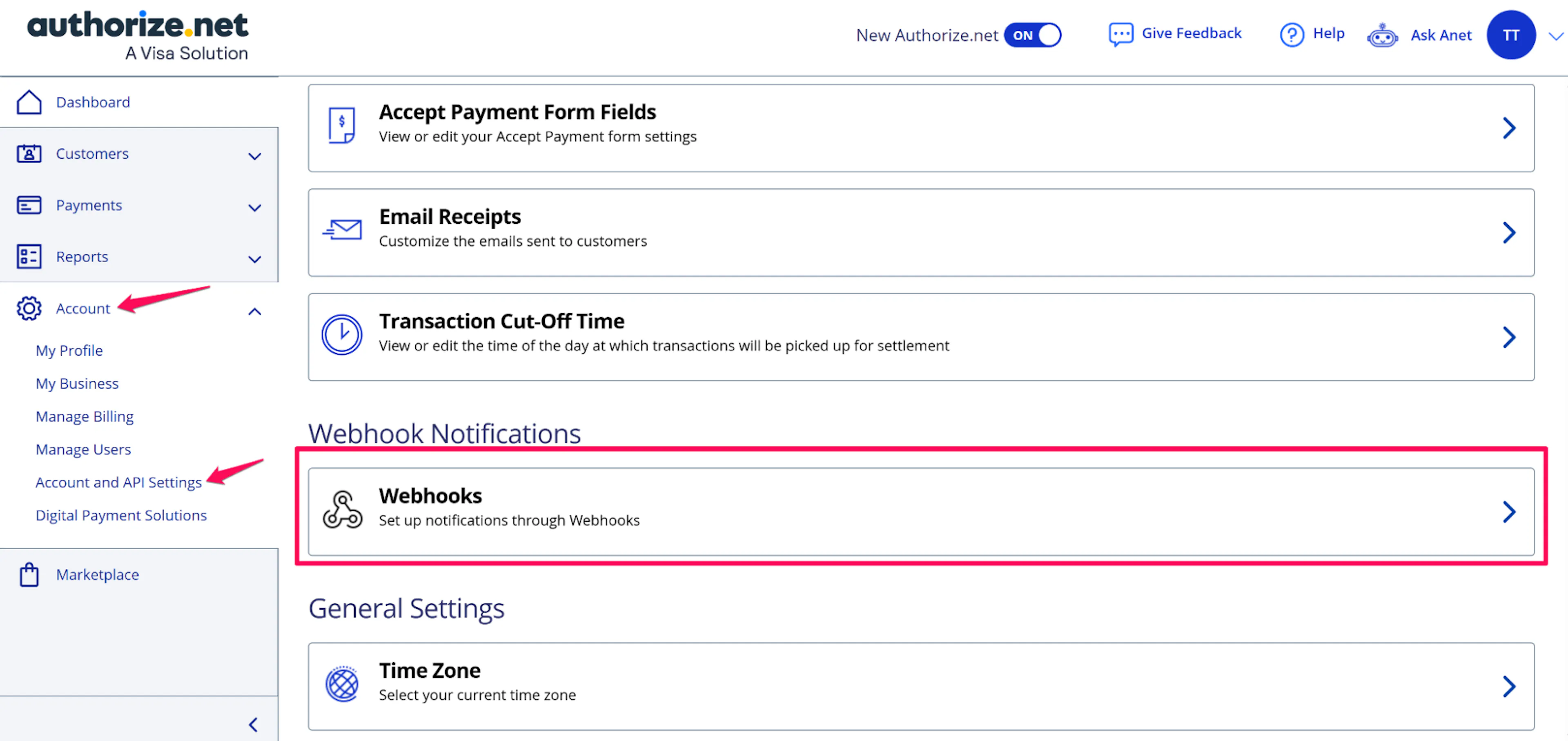 In the Authorize.Net Merchant Interface, go to Account → Account and API Settings → Webhooks.