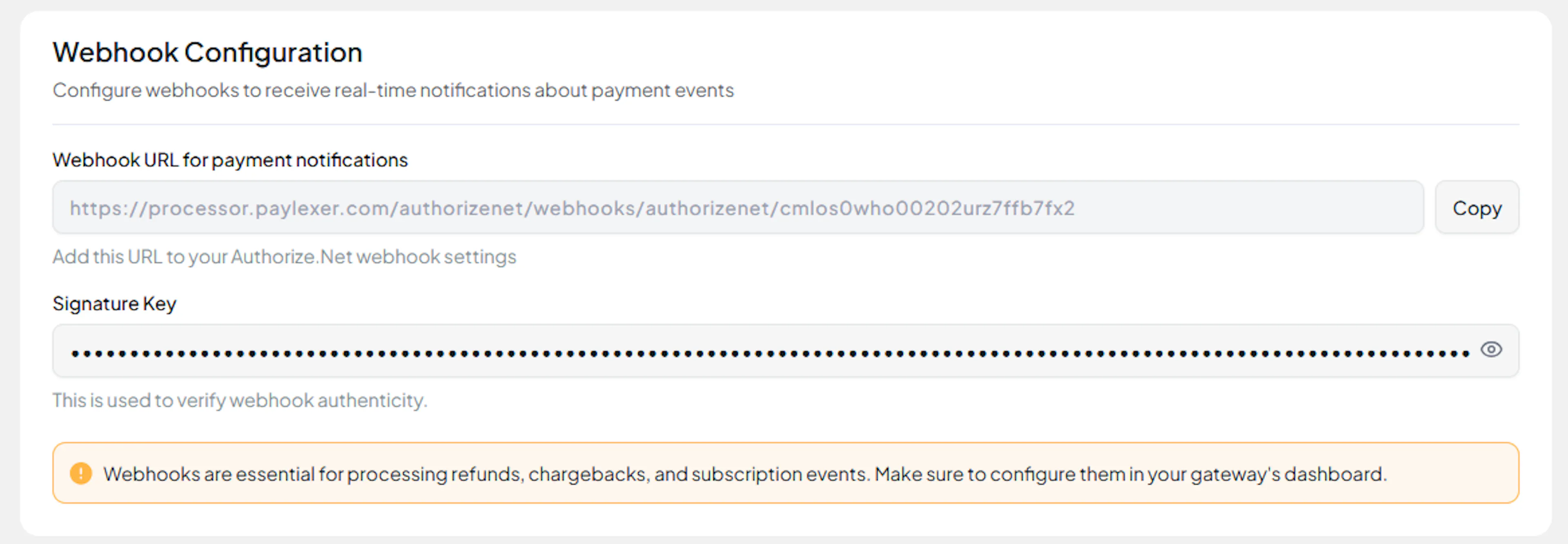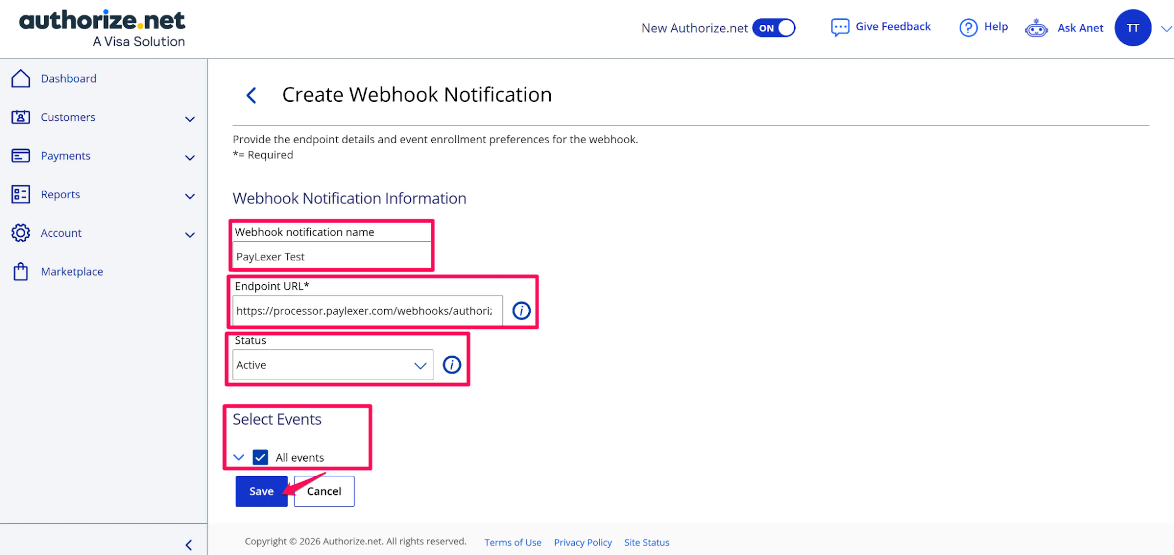 Copy the Webhook URL from PayLexer and paste it into Endpoint URL field in Authorize.Net and set Status to Activeselect the events you want to receive then click Save