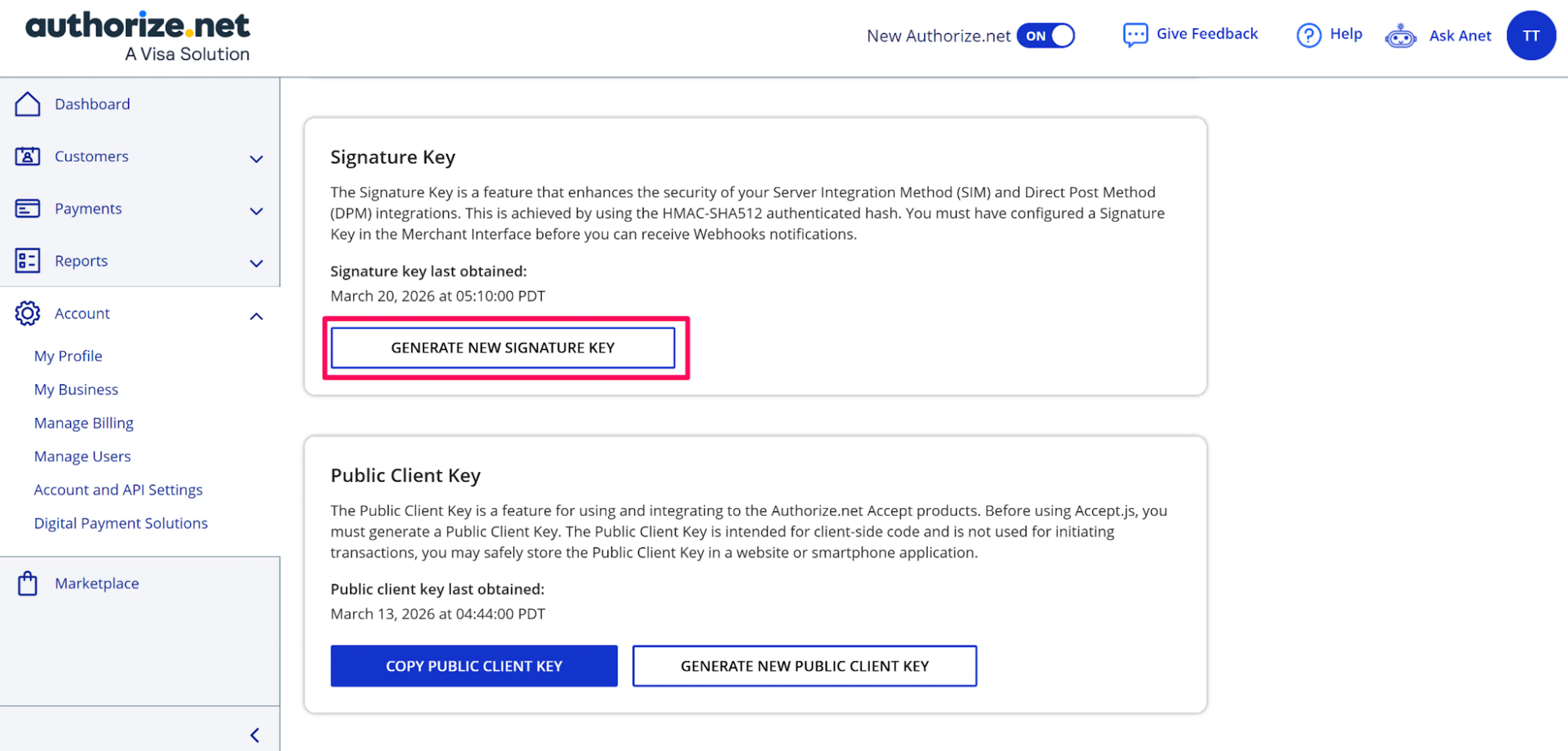 Save your Transaction Key and Signature Key immediately - they are shown only once and cannot be retrieved later.