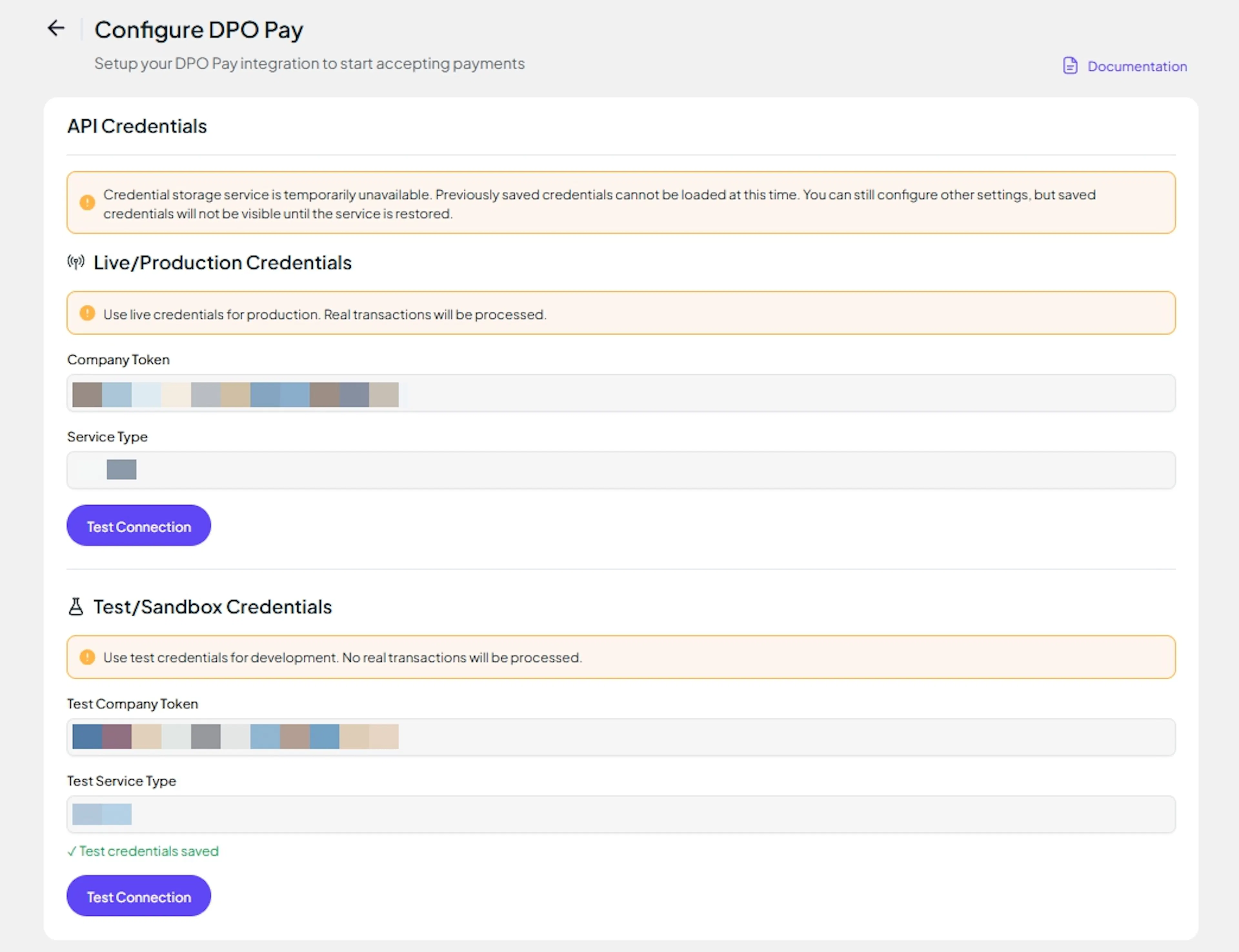DPO provides separate Company Tokens and Service Types for Test and Live environments. Request credentials for both environments to enable full testing.
