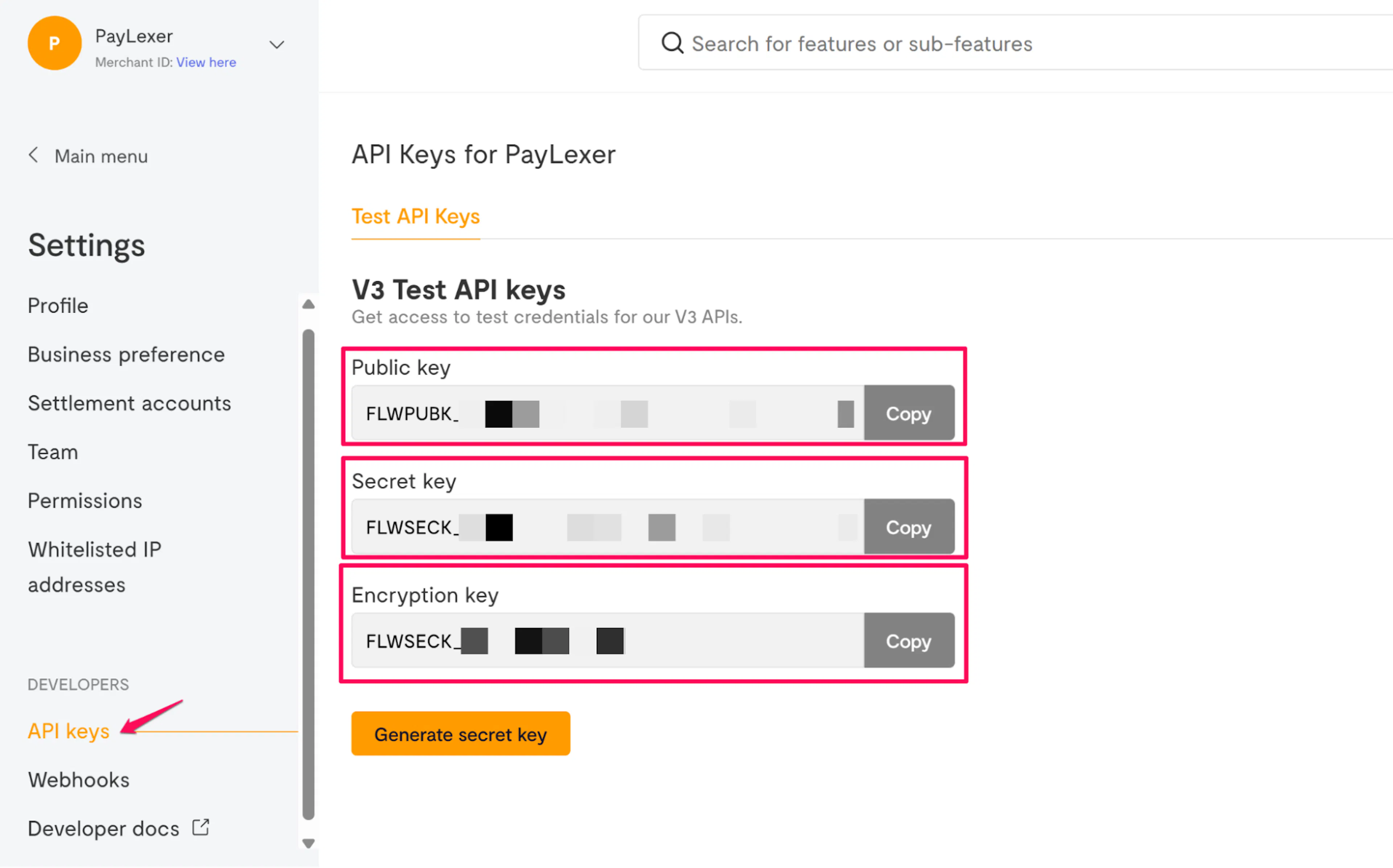 Paste the credentials you copied from Flutterwave.