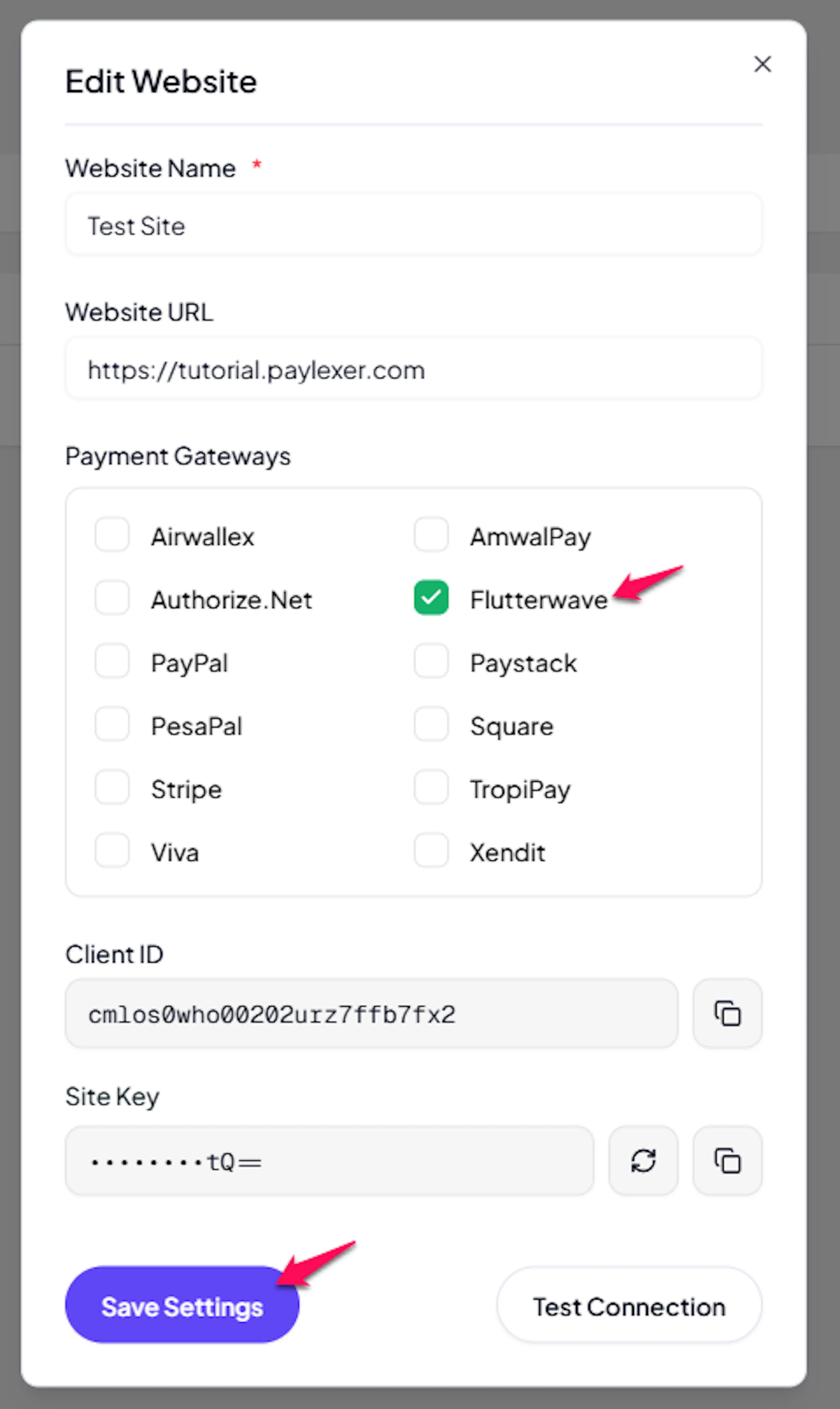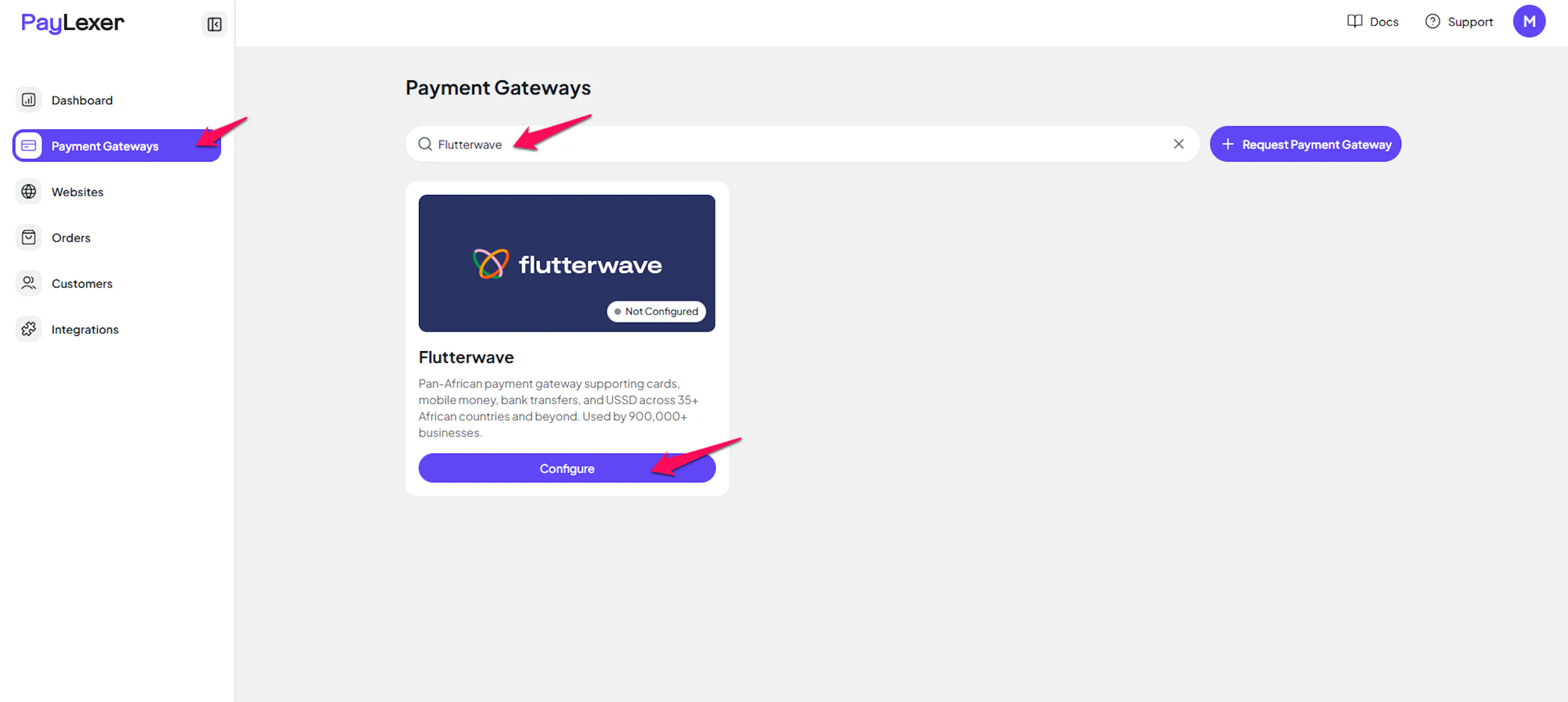 Log in to your PayLexer dashboard and navigate to Payment Gateways → Flutterwave.