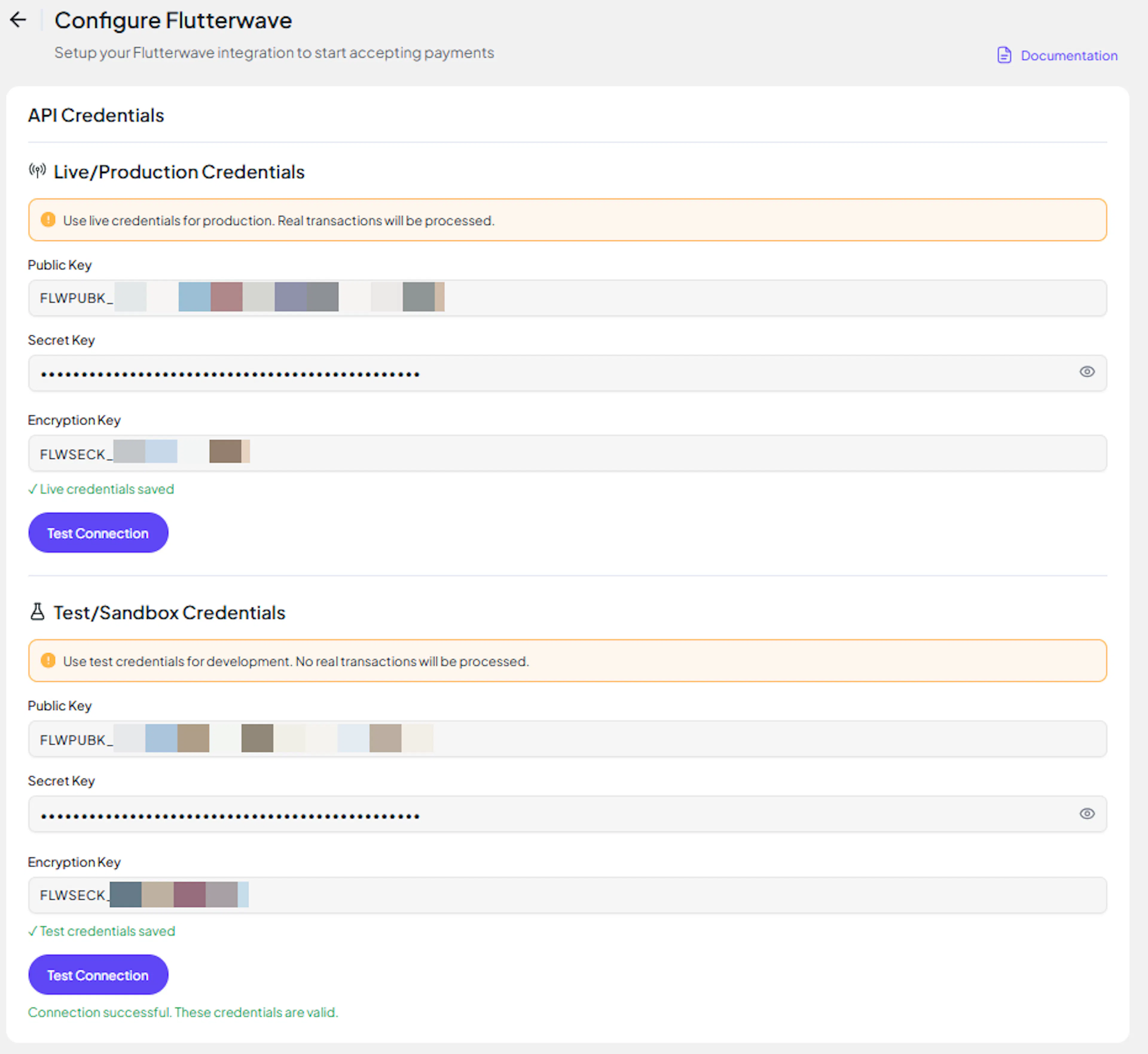 Flutterwave provides separate credentials for Test and Live environments. Configure credentials in both environments to enable full testing.