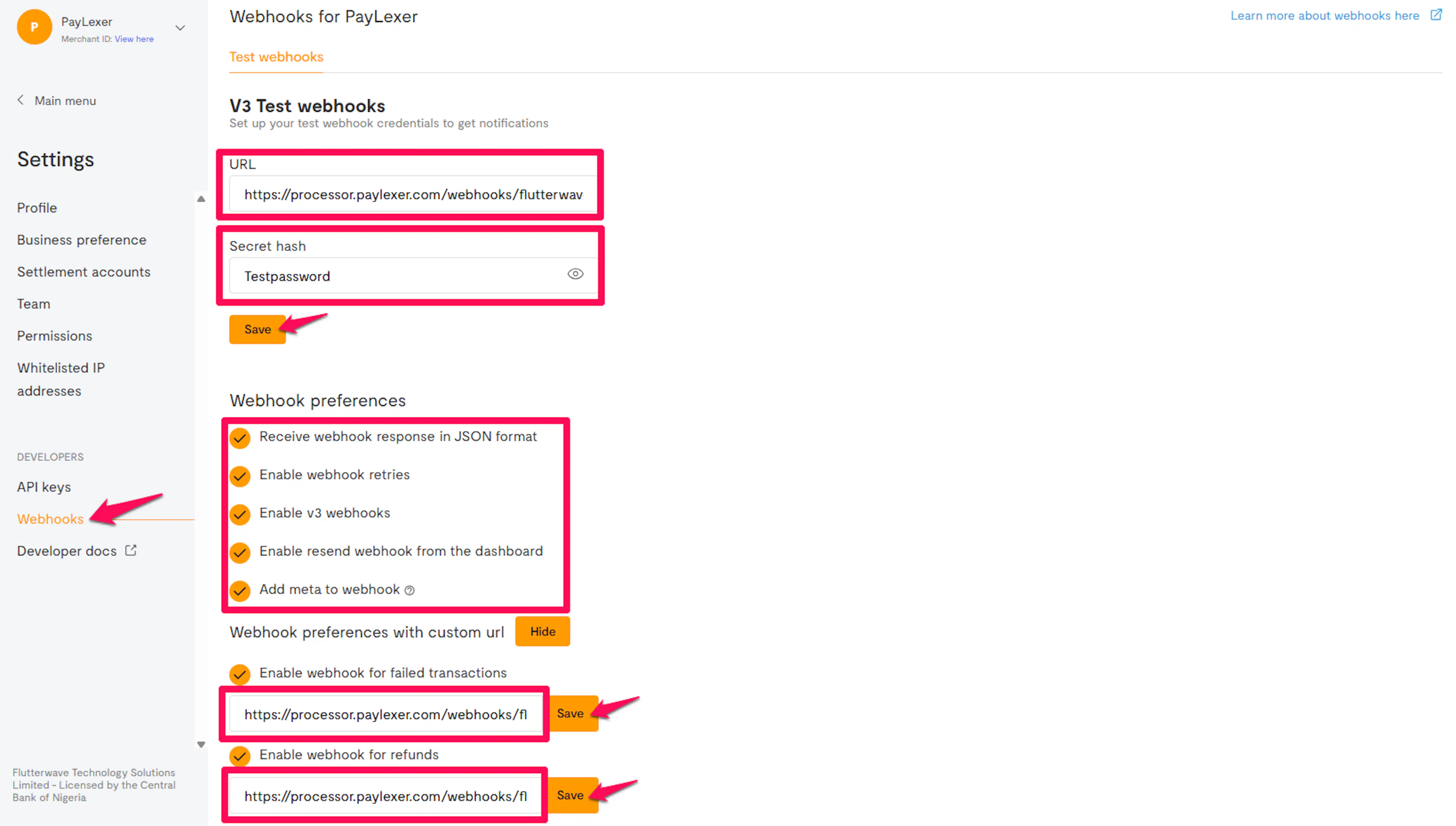 Enter a Secret Hash of your choosing, select your webhook options, and enter the Webhook URL from PayLexer for failed transactions and refunds. Click Save.