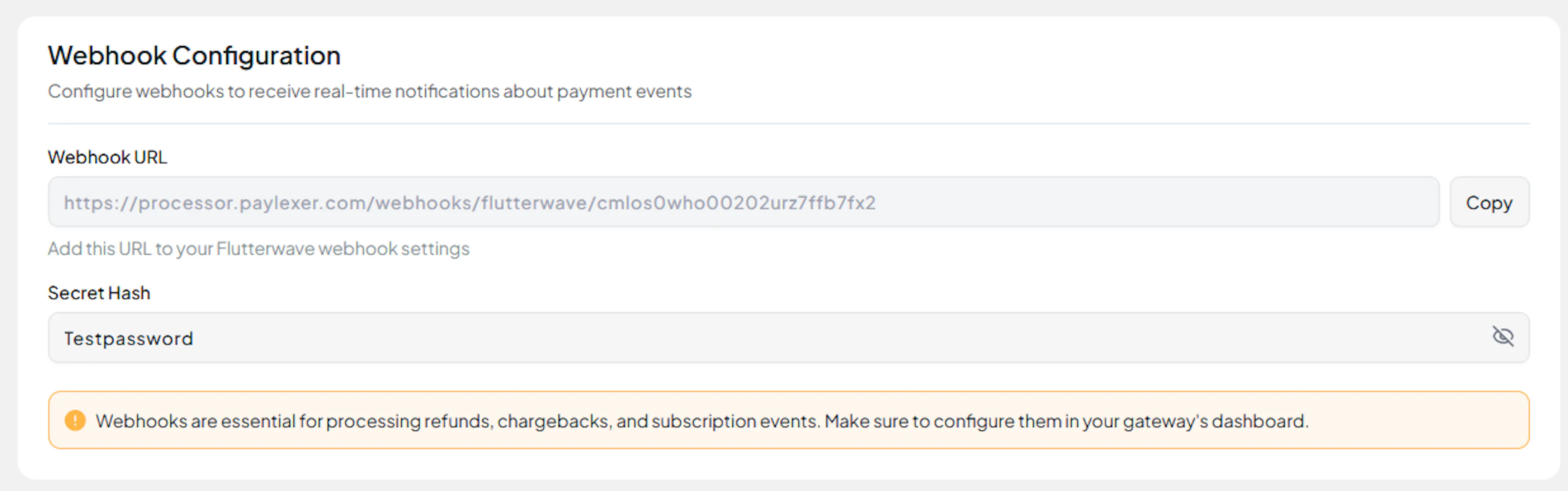 Save your Secret Hash securely - you'll need it for both the Flutterwave dashboard and PayLexer configuration.