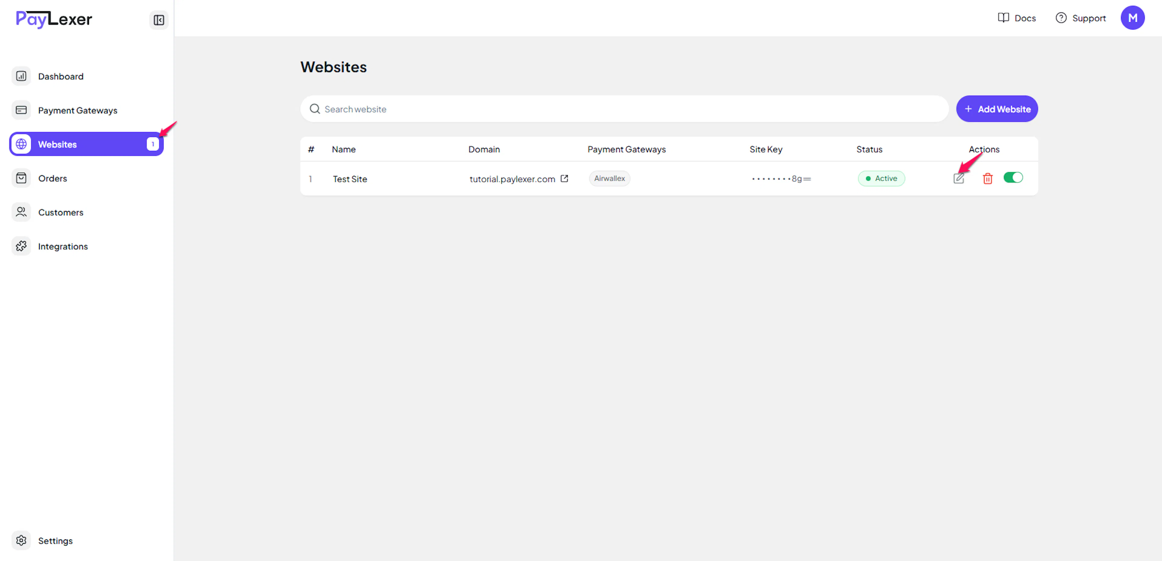 Navigate to Websites in your PayLexer dashboard.