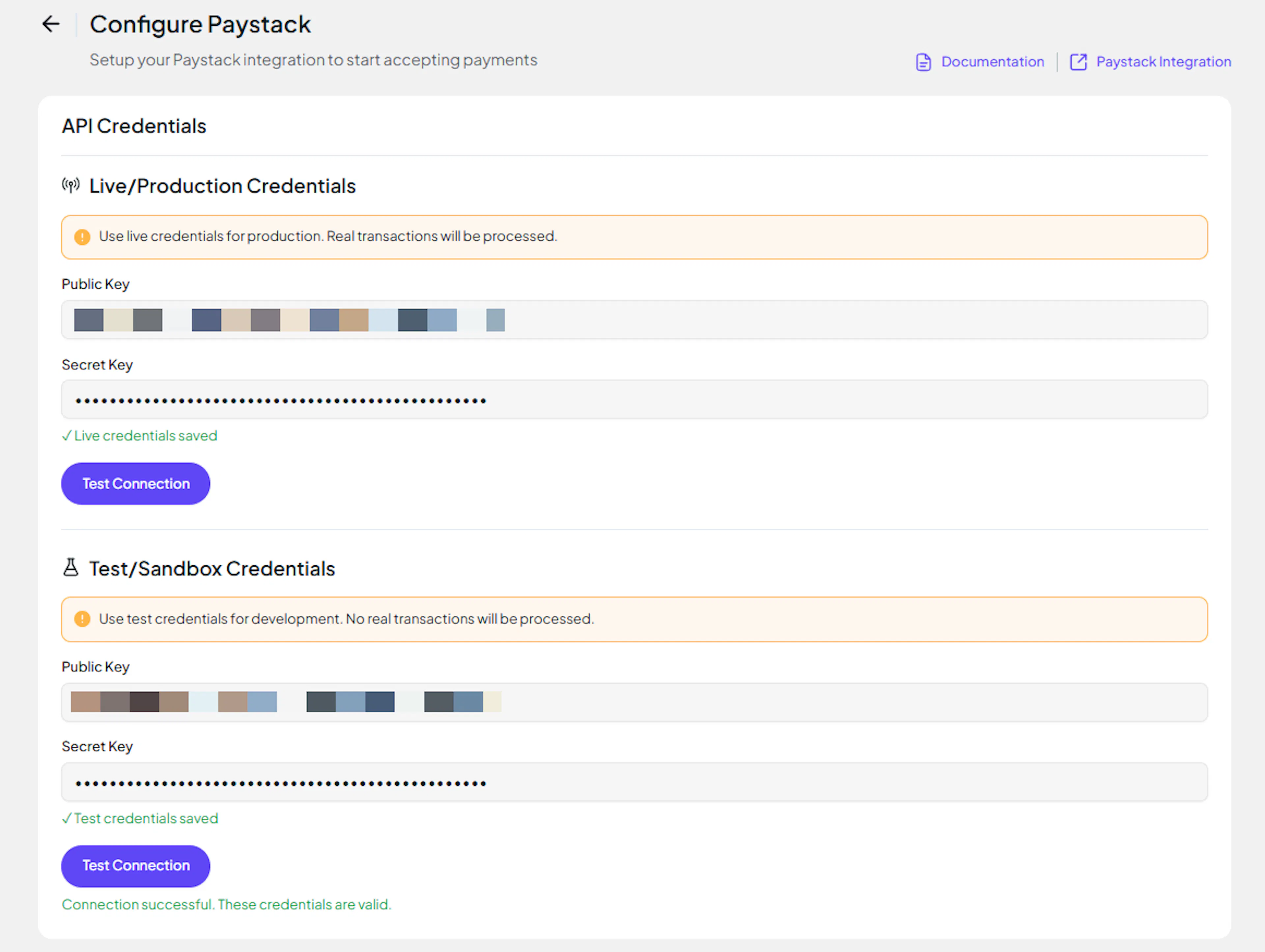 Paste the Secret Key and Public Key you copied from Paystack.
