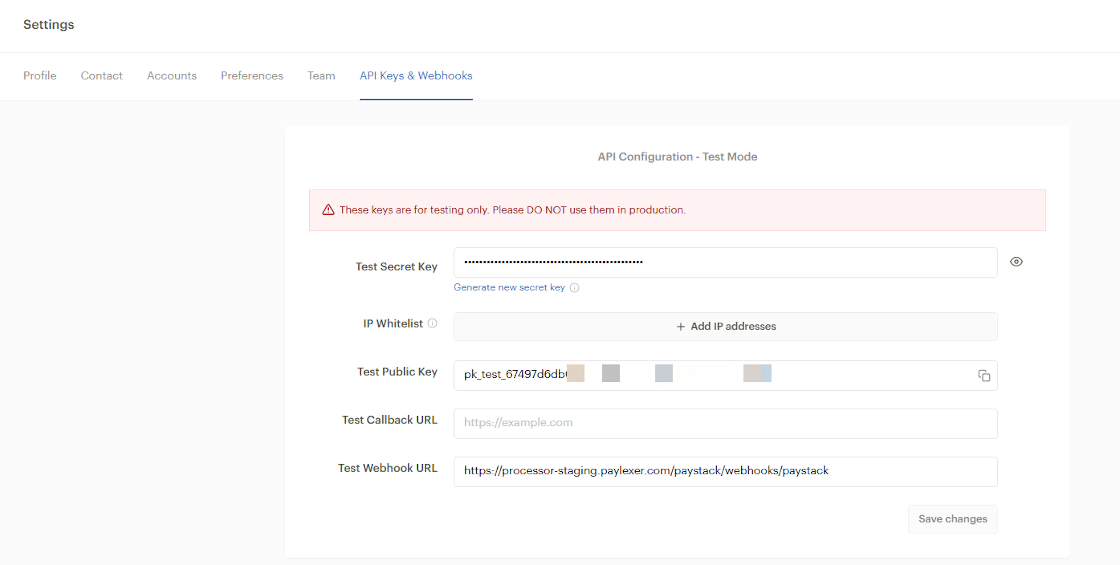 Copy the Webhook URL from PayLexer, paste it into the Webhook URL field in Paystack, and click Save changes.