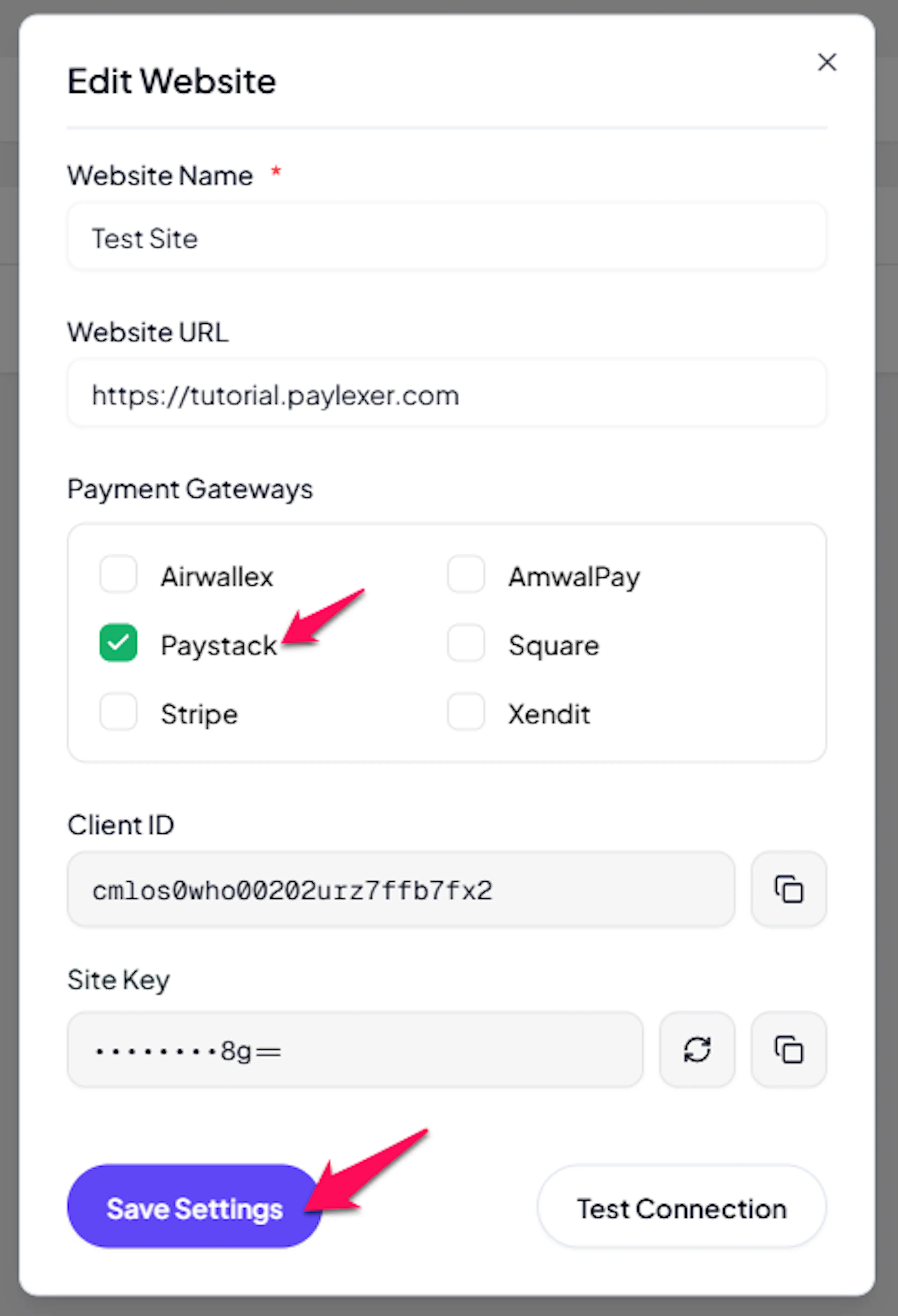 If you have already added and configured your site, you can enable Paystack in your existing setup.
