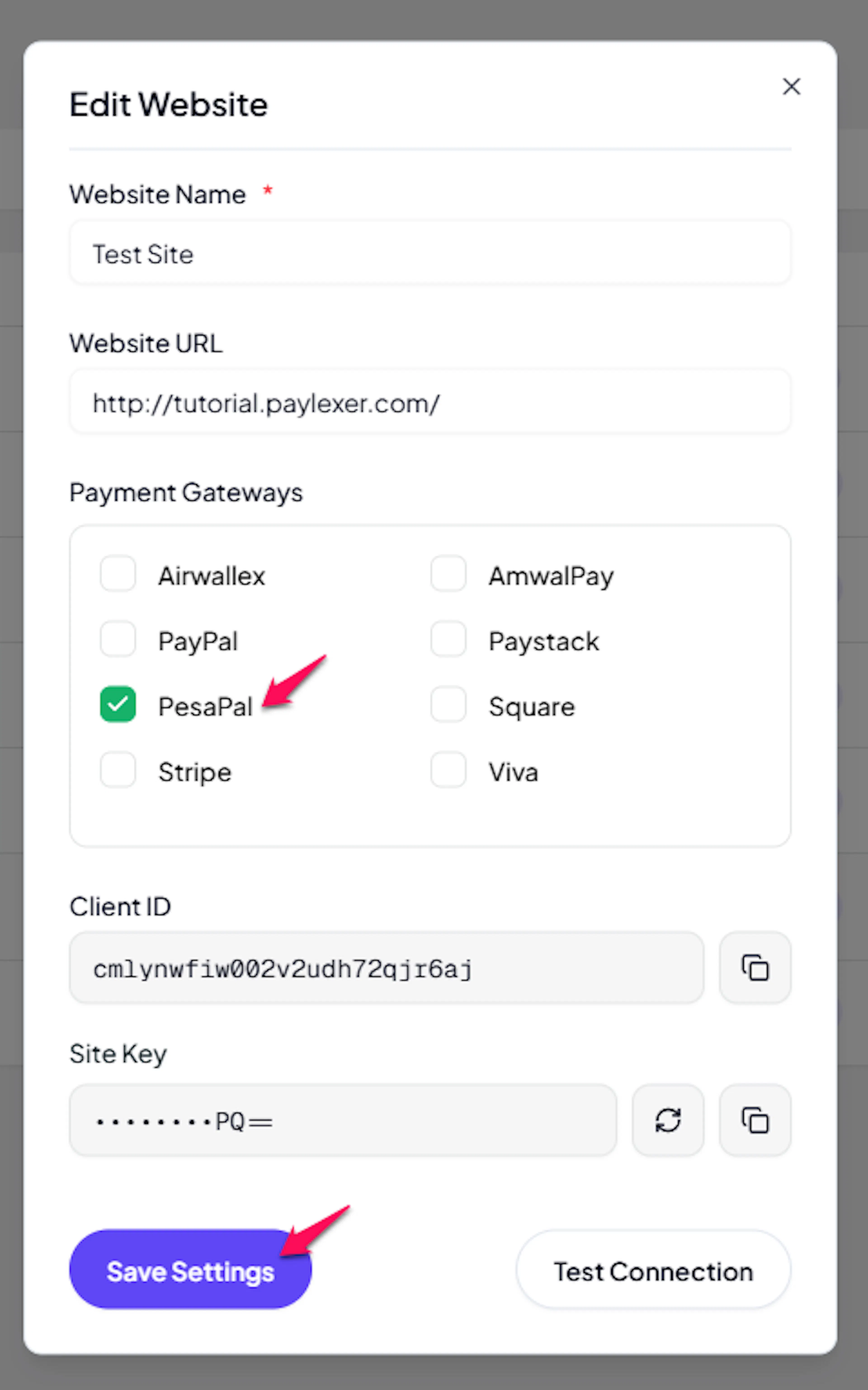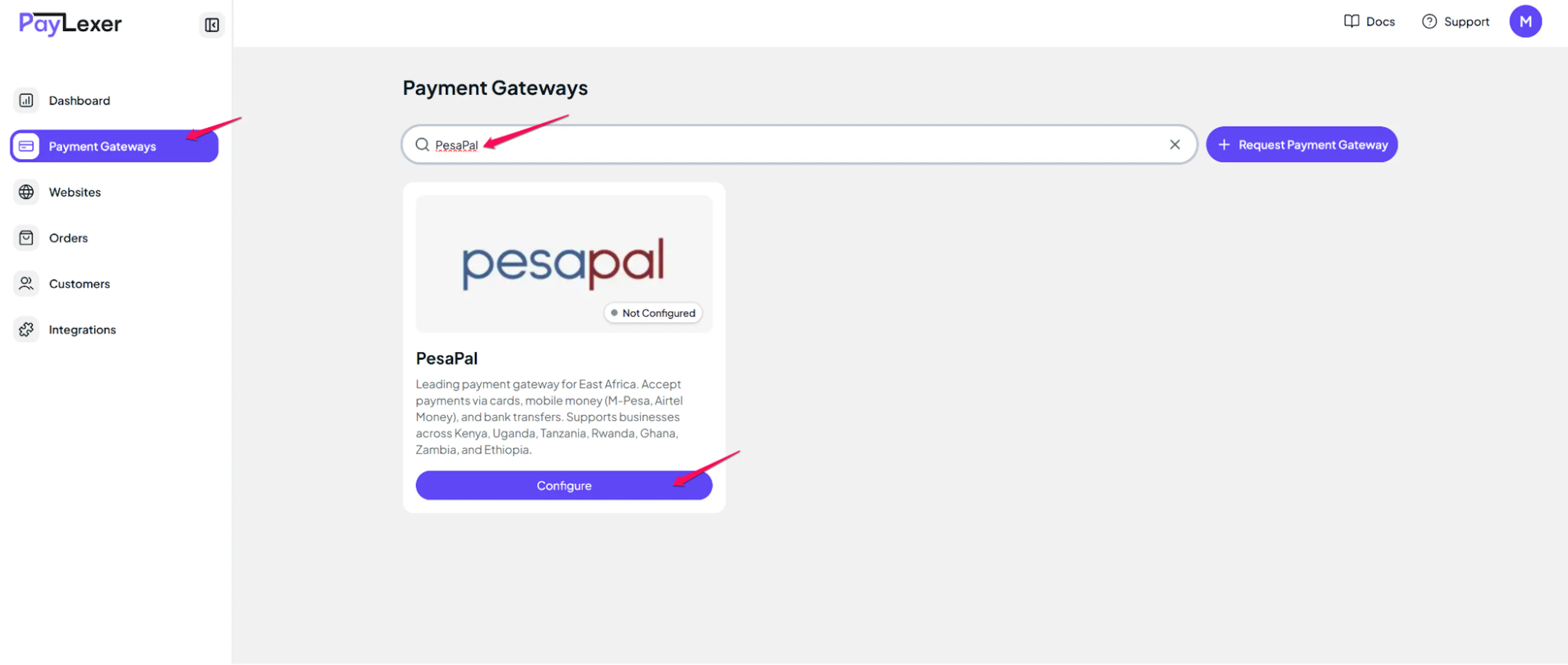 Log in to your PayLexer dashboard and navigate to Payment Gateways → PesaPal.