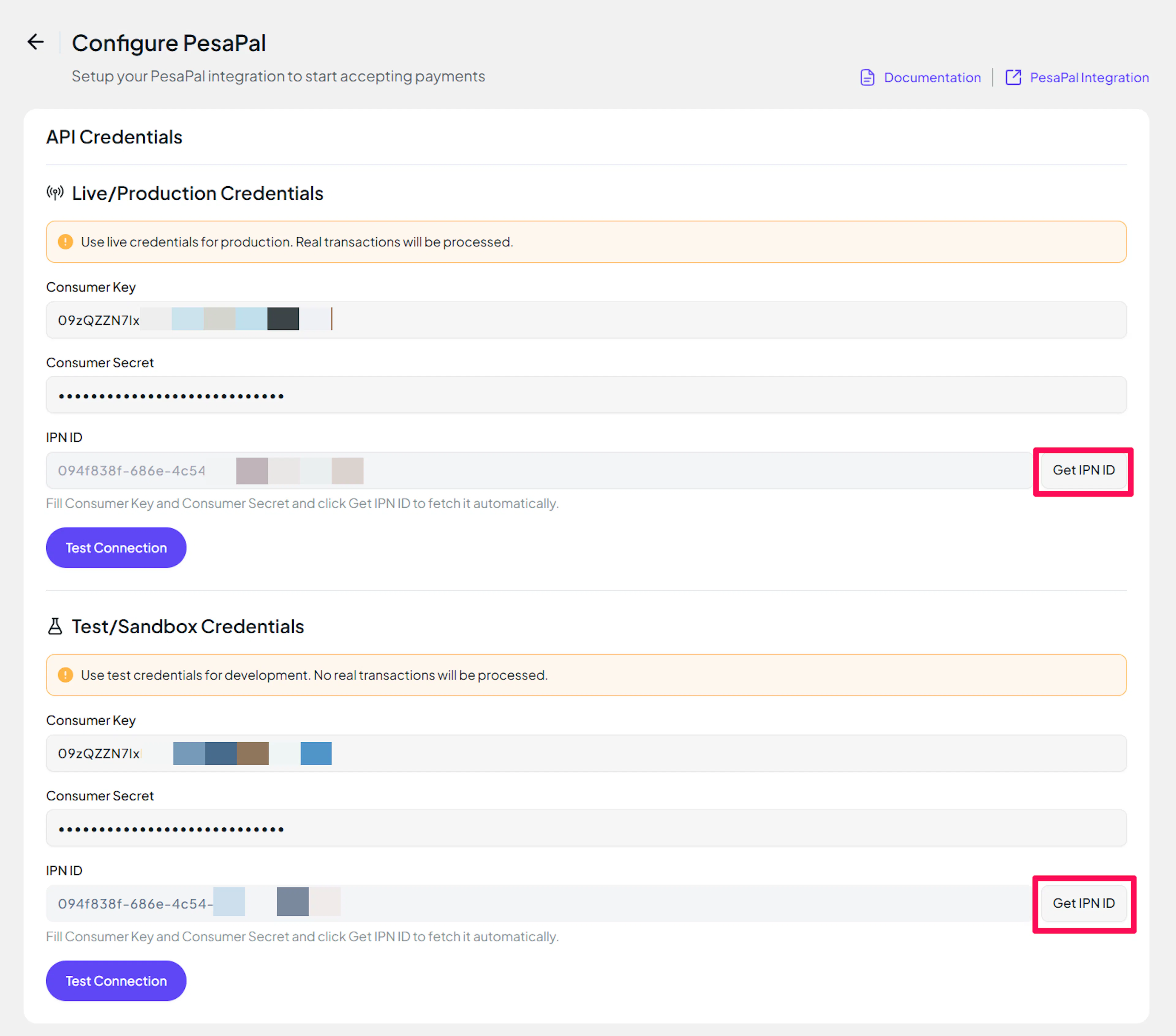 IPN is environment-specific. You have separate IPN Notification IDs for Demo and Live environments. PayLexer automatically creates and registers the IPN URL with PesaPal when you click "Get IPN ID" - this is why the IPN ID field is located in the API Credentials section alongside your Consumer Key and Consumer Secret (all three are environment-specific credentials).