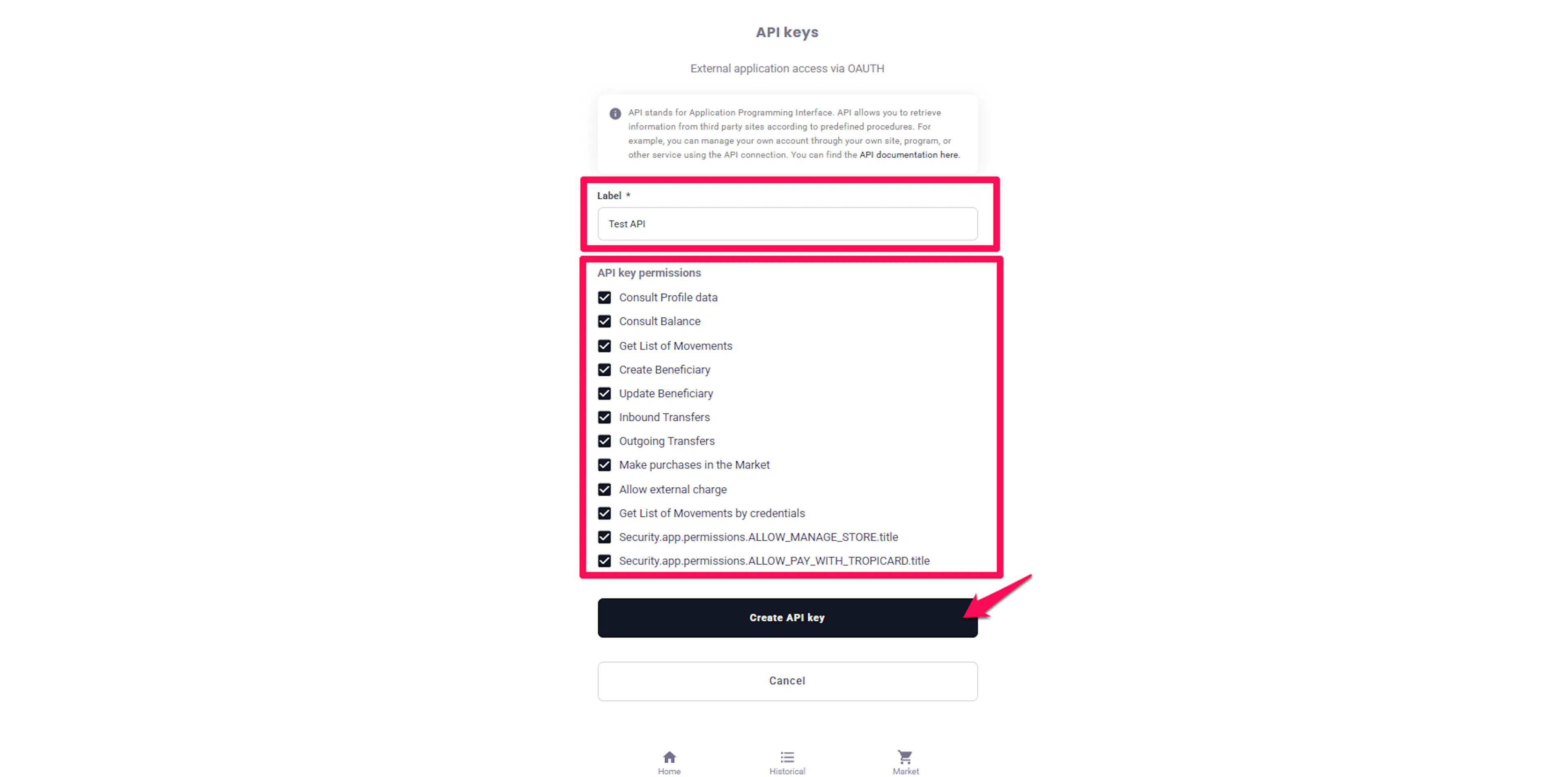 Enter Label nameand select API key permissions and click Create API Key then enter** SMS code** and click Next