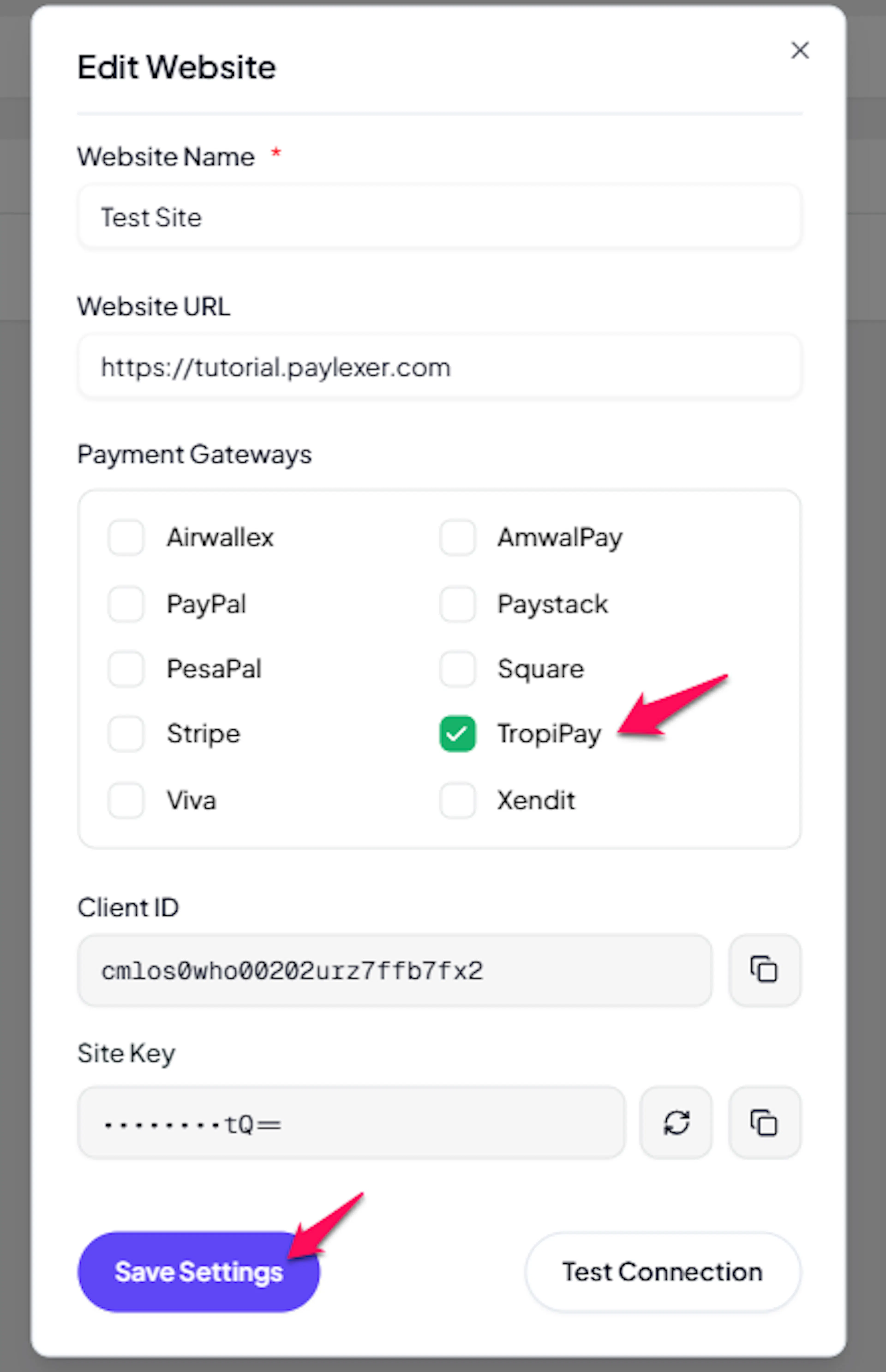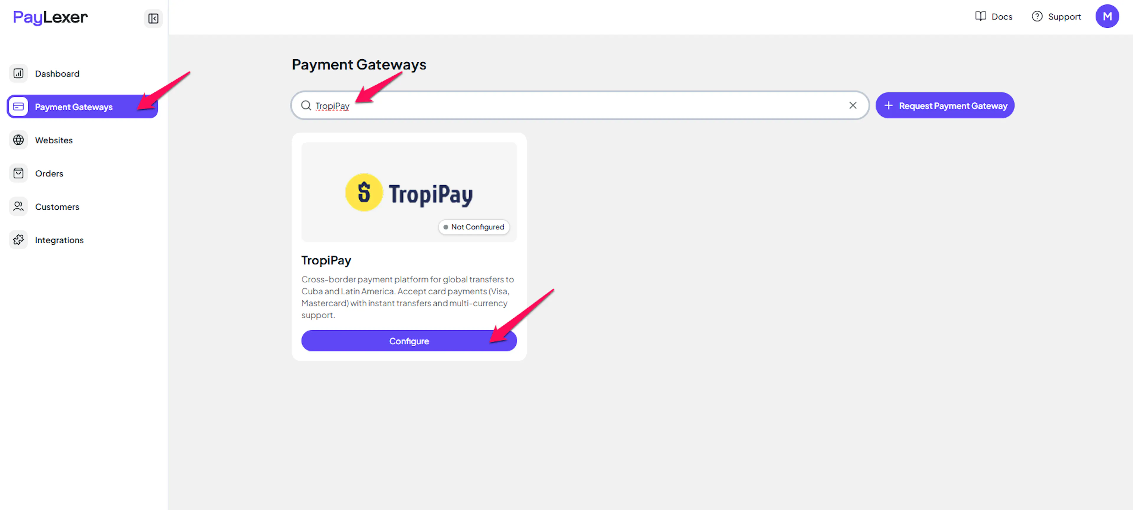 Log in to your PayLexer dashboard and navigate to Payment Gateways → TropiPay.