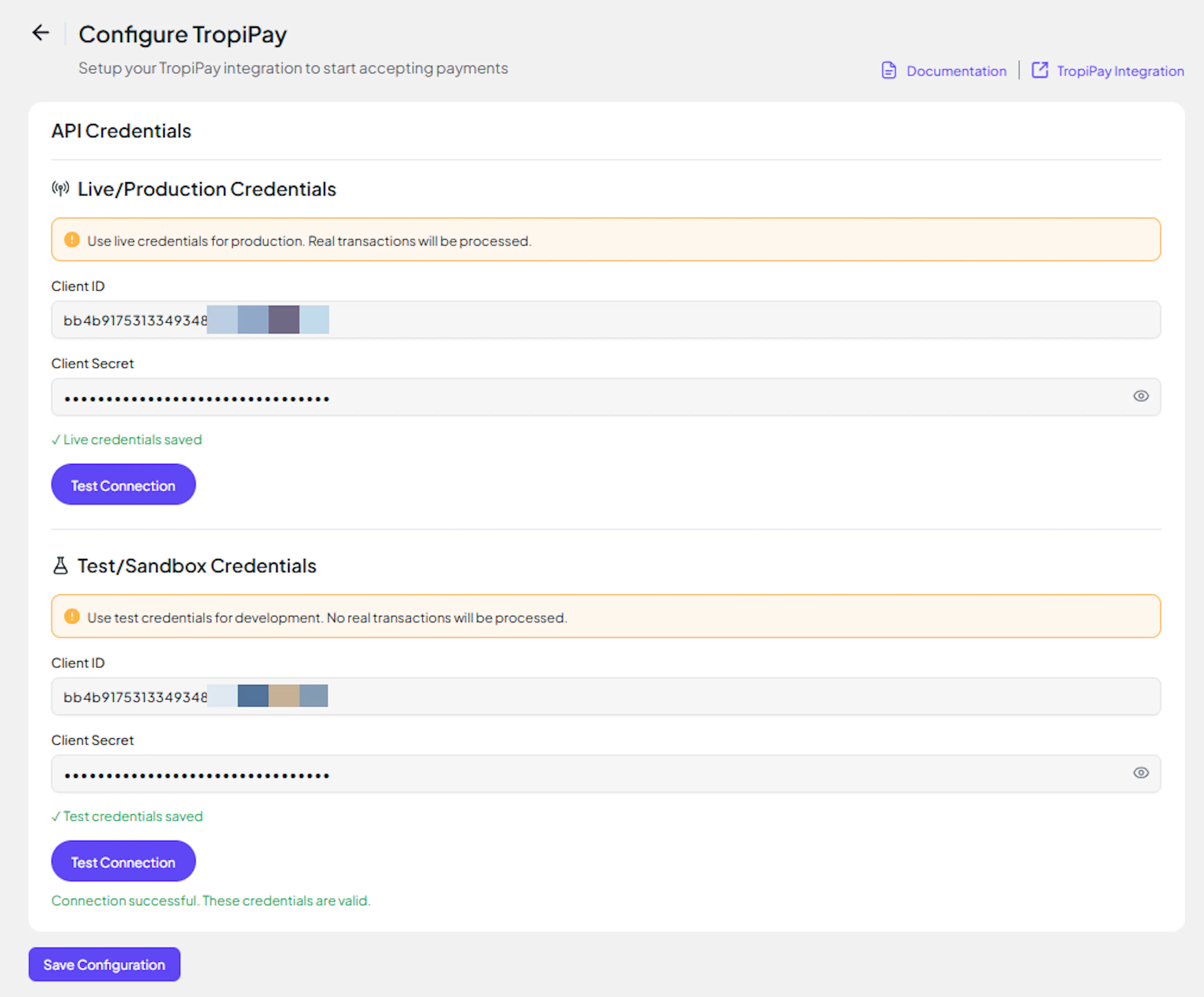TropiPay provides separate credentials for Sandbox (testing) and Production environments.