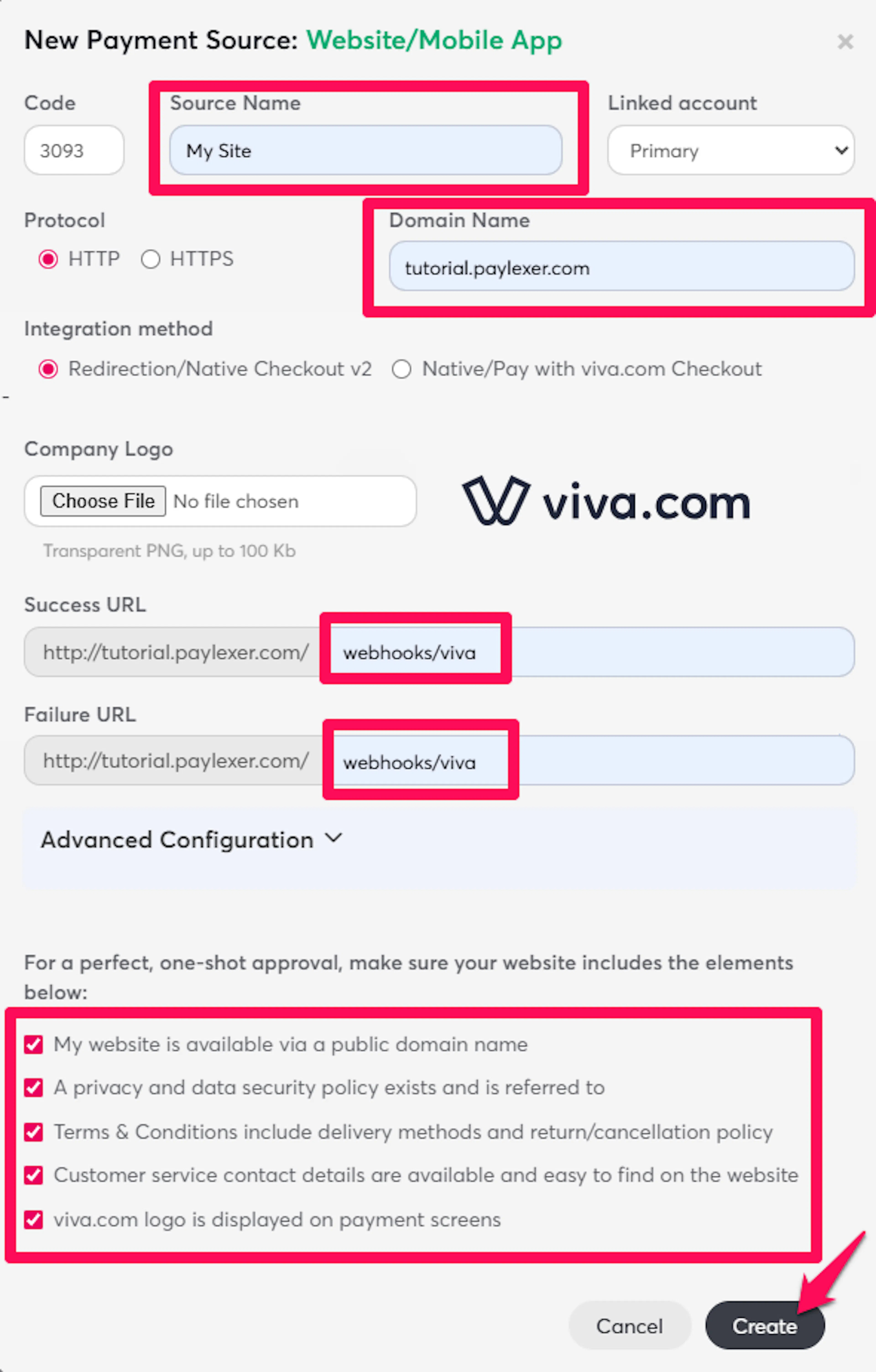 Enter the Source Name and your Domain Name and fill Success URL and Failure URL with webhooks/viva and select all the checkboxes