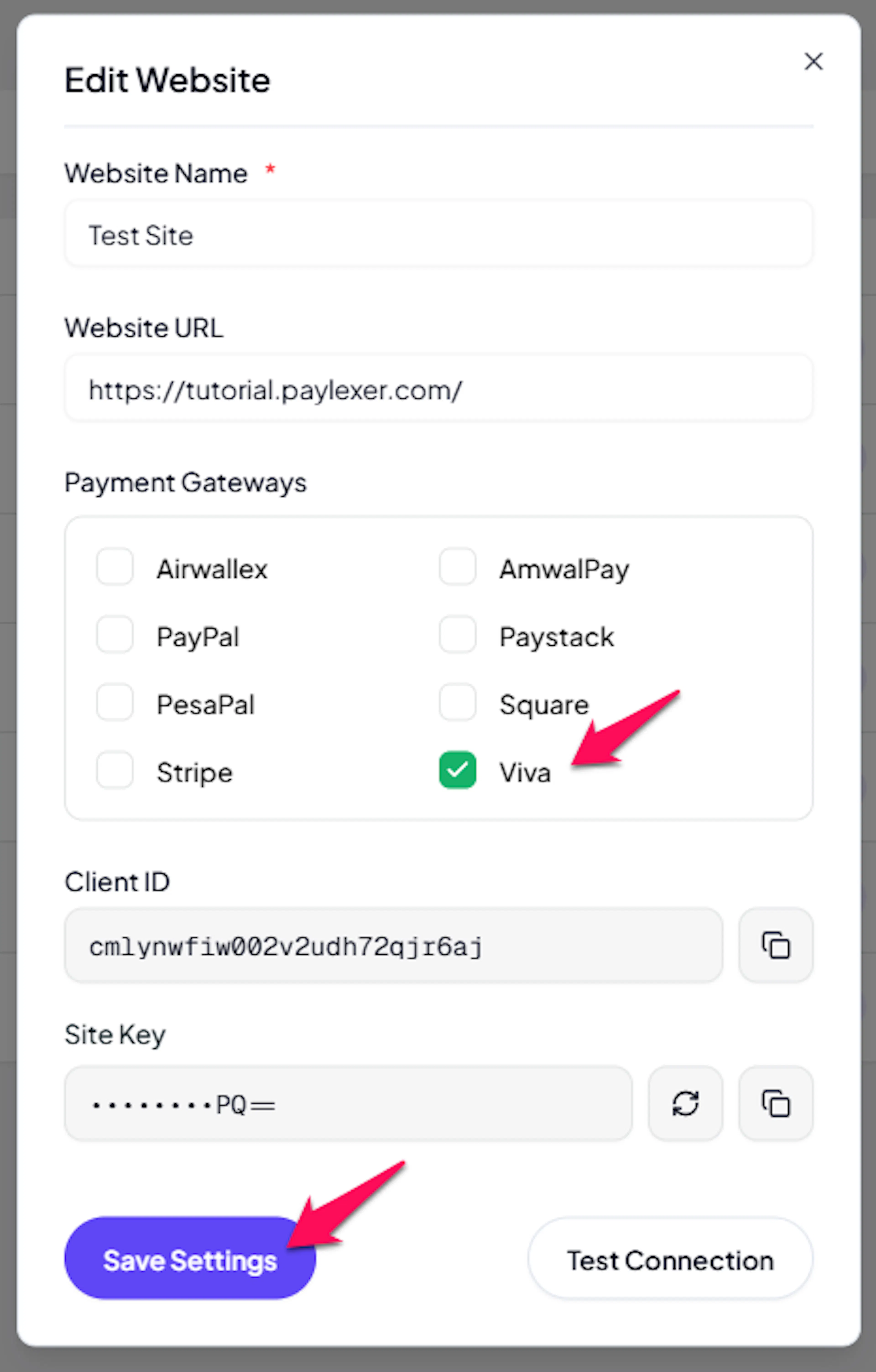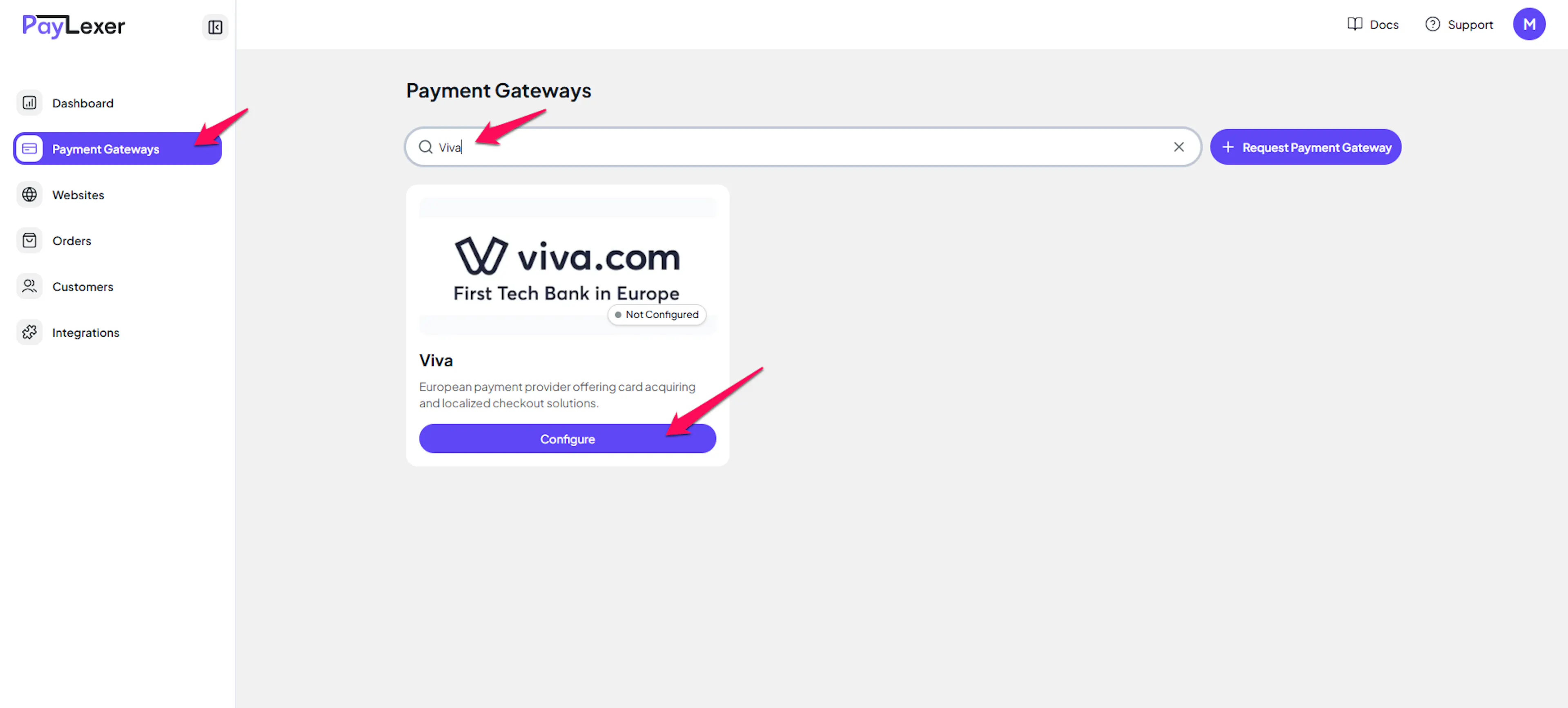Log in to your PayLexer dashboard and navigate to Payment Gateways → Viva.