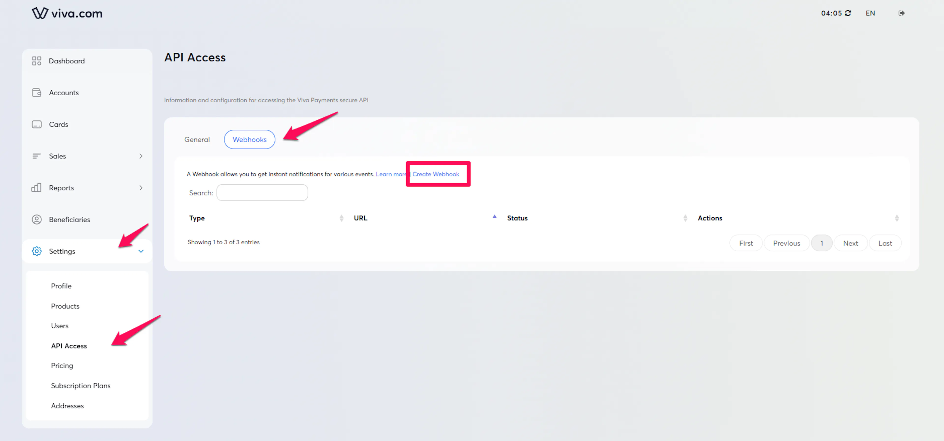 In your Viva Dashboard, navigate to Settings →API Access → Webhooks or the equivalent notification settings and click on Create Webhook.