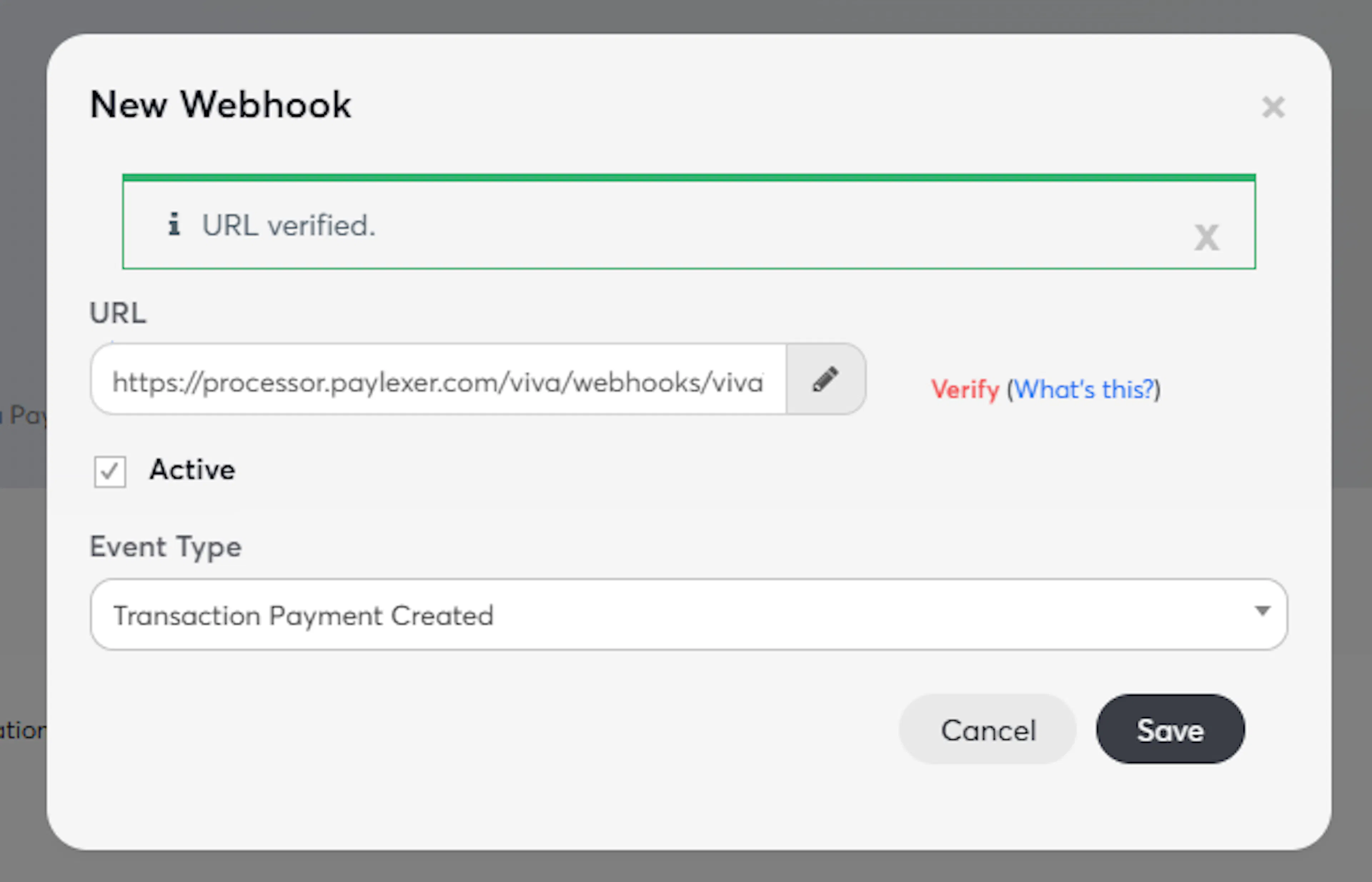 Copy the Webhook URL from PayLexer and paste it into Viva's webhook endpoint field.